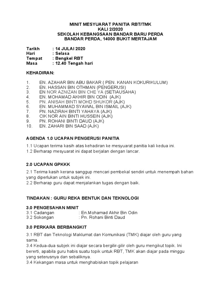 Minit Mesyuarat Rbt Dan Tmk Kali Ke 2 2020 Pdf Free Pdf